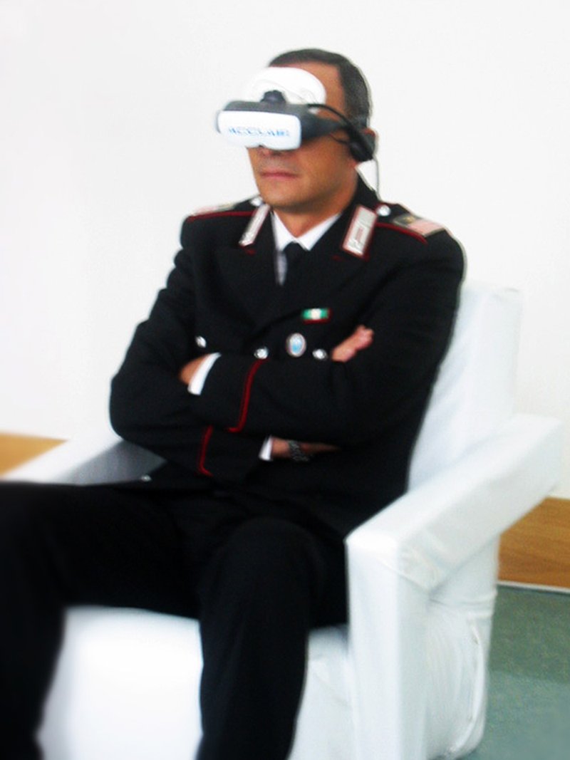 Acclair airport security clearance station, still image from promotional video, Interaction Design Institue Ivrea 2004; video headset, computer, custom software simulating Brain Fingerprinting application, fake brainscanning prop