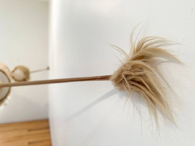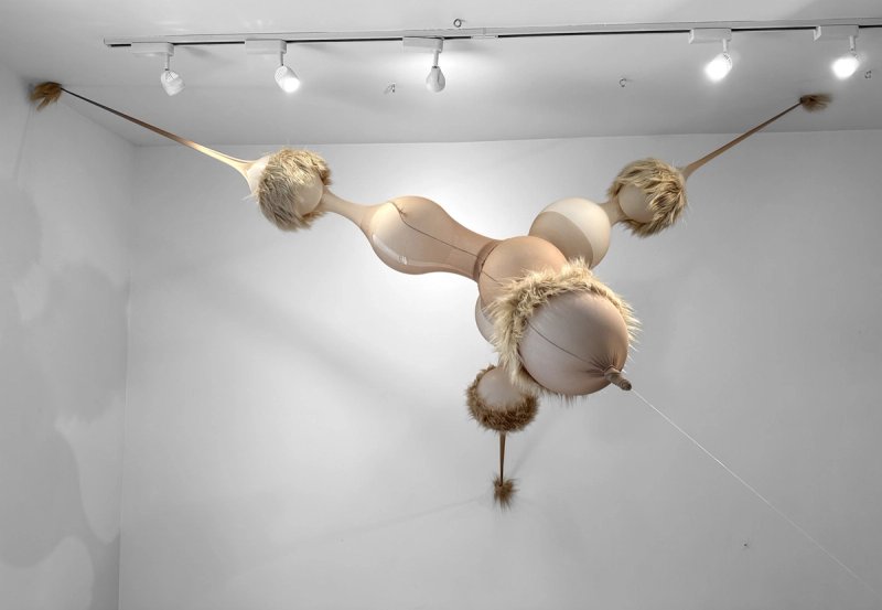 A spider-like form was created by stretching pantyhose over balloons and adding synthetic fur. Simple yet elegant, the soft sculpture’s curves and transparent mesh create a sensuous wildness, possibly of an android nature. It could be a trained attendant, keeping watch over a laboratory environment. For this proposal, it is intended to hang above the viewer on the ceiling and walls. Its legs can be stretched to fit various spaces depending on site. See version 2 using inflated PVC
