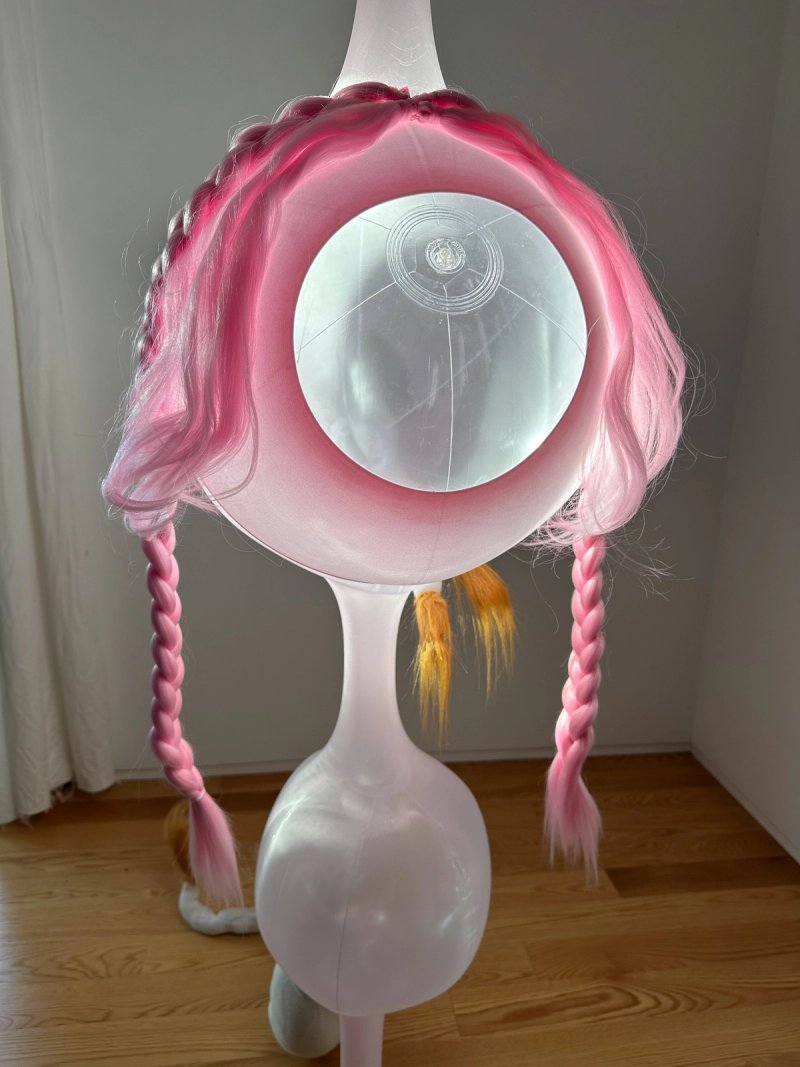 fake hair, inflated PVC, fake fur, stockings, glass marbles